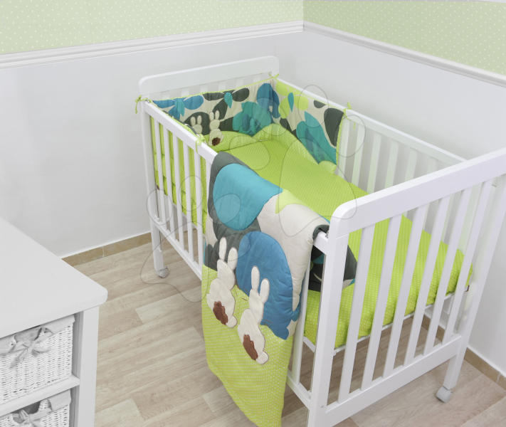 Három részes garnitúra babaágyba a smarTrike vállalat Joy kollekciójb ól egy modern kiegészítő szett kisbabák részére, mely zöld színben tündököl. Tökéletesen megfelel kisfiúk részére születésük pillanatától fogva. Gyermekeknek, akik még nem rég jöttek a világra, biztosan nagy örömet szerez az élénk szín és aranyos nyuszis motívum a bársonyos takarón és fe