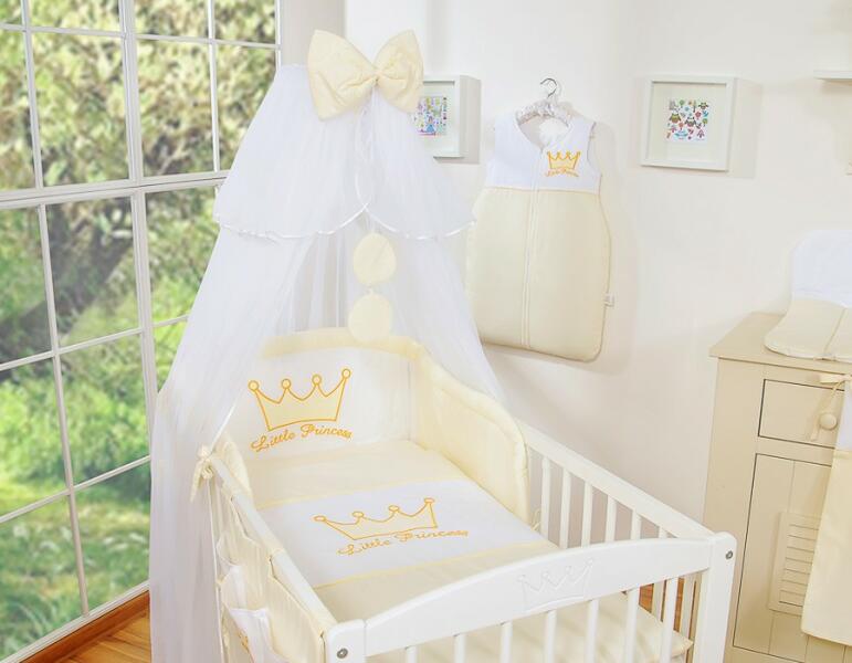 Gyerek ágyneműkészlet kis herceg vagy hercegnő számára. Terjedjen a hangulatos légkörben. Ágyneműkészlet 3 db- Gyűjtemény Kis hercegnő / Hercegnő A készlet tartalmaz: 1. Párnahuzat 40x60cm. 100% pamutból készül. 2. Paplanhuzat 90x120 cm . 100% pamutból készül. 3. Univerzális rácsvédő 35x188cm. Külső anyag 100% pamut, párnázat 100% poliészter. 4. Baldachin - 470x160