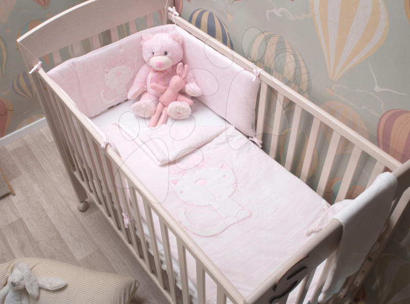 Classic rózsaszín garnitúra babaágyba tökél etes minden kis újszülött hercegnő részére. L egmodernabb dizájnban lett megalkotva, kellemesen puha és sima a bababőrnek. A szettbe tartozik egy sima takaró, strech lepedő és fejvédő babaágyba. Mindhárom eleme a szettnek légáteresztő 100% pamut jersey -ből készültek aranyos cicus motívummal díszítve. Kisbaba szett tökéle