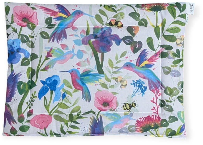 Gyönyörű, színes virágok és kolibri mintás borostyán porral töltött , 100% pamutból készült baba párna. Ha szeretnéd babádnál a borostyán áldásos, fogzást könnyítő hatását megtapasztalni, de elzárkózol attól, hogy babád nyakláncot viseljen, akkor ez az őrölt borostyánkővel töltött párna nagyszerű alternatíva lehet. A párna anyaga 100% természetes pamut, T