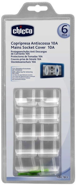 CHICCO - Vezetékvédő, 10 db. Megakadályozza, hogy a gyermekek megsérüljenek, ha ujjaikat vagy tárgyaikat az aljzatba dugják. A védelem a mellékelt kulccsal eltávolítható. 10 db csomagonként.
