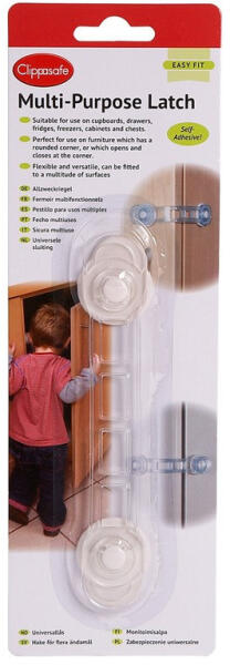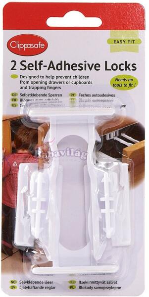 A Clippasafe öntapadós szekrény és fiókos zár 2db öntapadós fiókzárat tartalmaz. Ezek könnyen a szekrényekhez és fiókokhoz rögzíthetõk, hogy megakadályozzák a kisgyermekek illetéktelen hozzáférését a veszélyes dolgokhoz. Nem kell lyukakat csavaroznod a drága bútorokba. Bármifajta sérülés nélkül felhelyezhető a kívánt szekrényre, fiókra és ugyan ilyen sérül