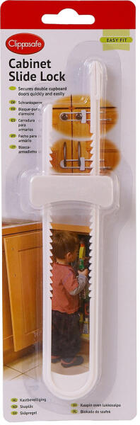 biztonsági gyerekzár szekrényre Clippasafe Csúszózár 72 - biztonsági gyerekzár szekrényre A kétajtós szekrények kinyitását akadályozza meg a kisgyermekek számára. A szekrény ajtók gombjaira helyezve, ezeket összefogja, a gyermek nem tudja az ajtókat kinyitni. Ezáltal elkerülhető, hogy a kicsi az ujjait odacsukja, becsípje. A kétajtós szekrények kinyitását akadályozza