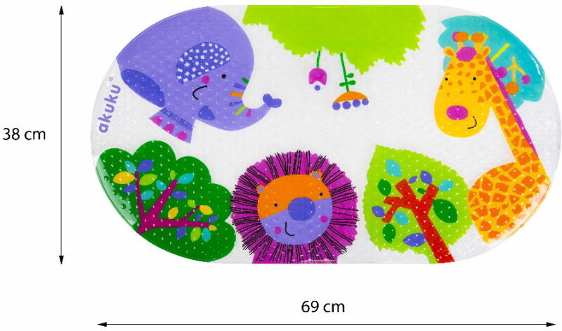 Biztonság a fürdőben Akuku csúszásgátló kádba 69x38cm szafari A praktikus, csúszásmentes „akuku tapadókorongos fürdőszőnyeg gyermekfürdőkádakban, nagyméretű kádakban és zuhanyzókban való használatra készült. Megakadályozza a baba elcsúszását fürdés közben. A szőnyeg vonzó kialakítása ösztönzi gyermekét a fürdésre. Előnyök: - növeli a biztonságot für