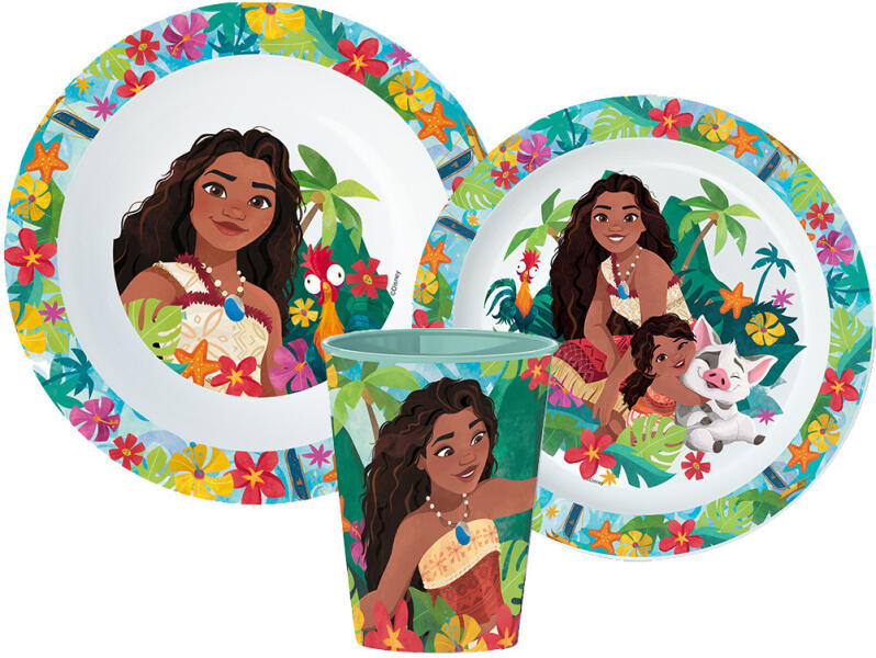 Disney Vaiana étkészlet, micro műanyag szett -BPA Mentes -Származási ország: Spanyolország -A termék környezetbarát, újrahasznosítható anyagból készült a Föld védelmében. Csomagolás nélkül! A készlet tartalma: 1 db mélytálka (Mikrózható műanyag) 1 db lapostányér (Mikrózható műanyag) 1 db pohár 260 ml (600 watton mikrózható max. 2 percig) A termék anyaga: műany