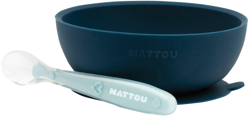 A Nattou kétrészes, puha szilikonból készült étkészlete nagyon praktikus, könnyen megfogható és csúszásgátlós. A készlet egy tapadókorongos tálat és egy kis kanalat tartalmaz. A tál lekerekített belső szélei megkönnyítik az ételek felvételét. Jellemzők: - az étkészlet puha, rugalmas szilikonból készült, amely leeséskor nem törik el. - a tapadókorongos tál, kön