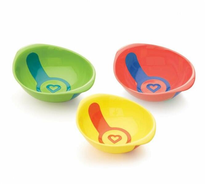 Tommee Tippee fedő nélküli, vidám és színes etetőtálkák (Feeding bowls). A tálkák alja háromszög alakú, könnyen kikanalazható belőle az utolsó falat is. Egymásba rakva is tárolhatók így kevesebb helyet foglalnak. Mosogatógép felső kosarába, mikrohullámú sütőbe és gőzsterilizálóba is betehető, BPA-mentes.