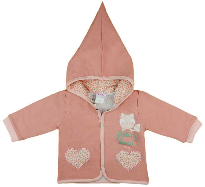 Kedves Kismamák! Kényeztessétek a kis hercegnőtöket ezzel a púderszínű, kapucnis kocsikabáttal, melyen aranyos cicás minták díszelegnek. A kabát elöl patentos kialakítású, így könnyen felvehető és levehető a babára. A magas minőségű, 90% pamut és 10% elasztán anyag garantálja a puhaságot és a rugalmasságot is, hogy a kicsi mindig kényelmesen érezze magát. Többet