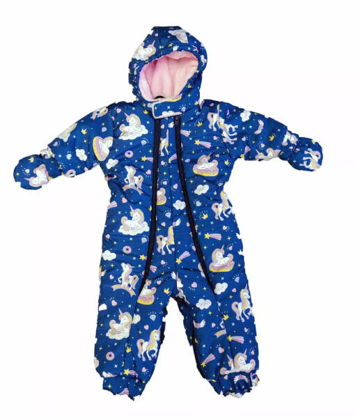 Overálok Mintás vízlepergetős, kapucnis bélelt overál kesztyűvel Egy igazán stílusos és praktikus választás a hideg hónapokra, ez cuki Unikornis mintás kapucnis overál. Az overál különlegessége, hogy bundazsákká alakítható, így a hideg téli napokon is tökéletesen megóvja a kicsiket a fagyos időtől. A vízlepergetős anyaga pedig biztosítja, hogy a hó és az eső sem
