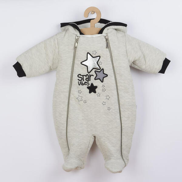 Eredeti és stílusos baba téli kezeslábas kapucnival Koala Star Vibes, kisbabák számára. Teljes hosszában a két oldalán cipzáros, ami megkönnyíti a baba öltöztetését és pelenkázását. Nagyon kellemes és puha anyagból készült, amelyben a baba nagyon kényelmesen fogja érezni magát. A kezeslábas teljesen bélelt pamut béléssel. A bélés a ruházat fontos része, növeli