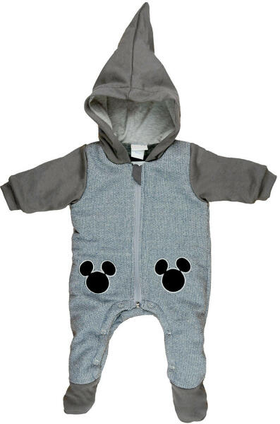 Puha, meleg és kényelmes - ez a Disney Mickey kapucnis bélelt baba overál tökéletes választás a hidegebb napokra. A szürke alapszínű overál pikáns kis részlete a Mickey egér karakter, amit a kisfiúk imádnak. A 74-es mérettől kezdődően lábfej nélküli változatban is kapható, így a kicsik könnyedén mozoghatnak benne. A minőségi magyar termék anyaga 100% pamut, míg a b