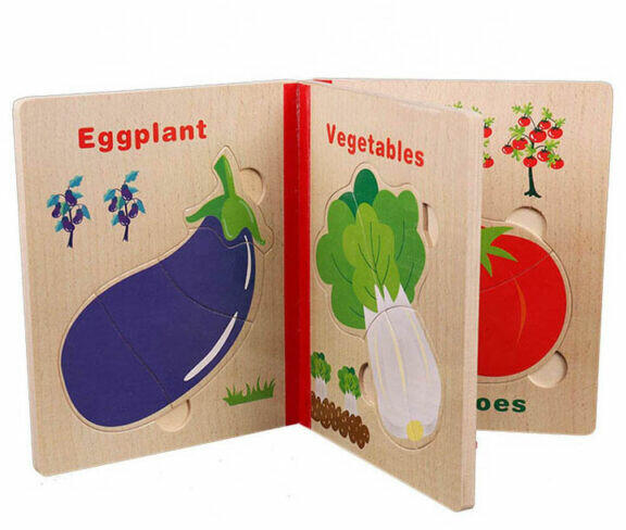 Játék baba könyv, 6 lapozható oldallal. Minden oldalán kirakóval. Mérete: 14,3 x 17 x 2 cm. Anyaga: fa. Többféle mintával is elérhető.