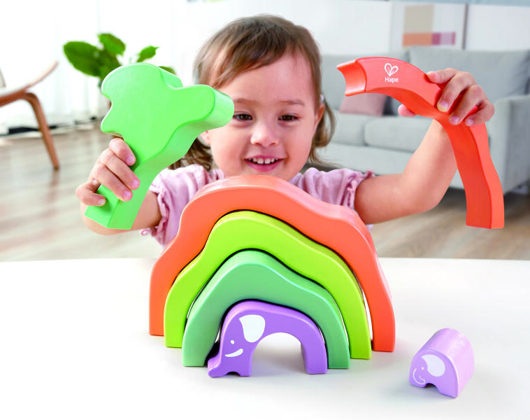 A Hape rakásolható elefánt készlete már 2 éves kortól játékra hívja a gyerekeket. A szett 7 db, különböző színű elemet tartalmaz. A kicsiknek az építésnél figyelembe kell venni a méretbeli különbségeket, hiszen az elefánt csak akkor rakható egymásba, ha megfelelő sorrendbe teszik az elemeket. A játék különlegessége, hogy az elefánt többféleképpen is megépíthe