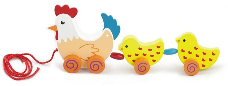 A Viga cégtől származó zsinóron lévő csirke csibékkel egy olyan játék, amely jól jön az első lépéseikhez készülő gyermekek számára. A tyúk és két csibéje egy piros zsinórral van összekötve. A madarak között színes gyöngyök vannak elhelyezve. Ha meghúzzuk, az egész köteg játékosan mozog. A játék 18 hónapos kortól alkalmas kisgyermekek számára. Az egész j