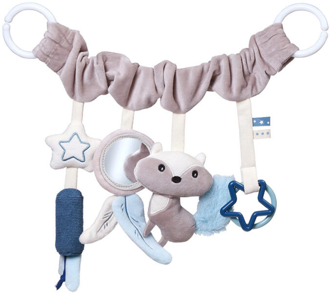 A Raccoon, egy oktató babakocsijáték ami változatosabbá teszi gyermeke világát, miközben támogatja a szem-fül és a szem-kéz koordinációt. Rögzítse babakocsihoz, kiságyhoz vagy autósüléshez, hogy a baba elfoglalt legyen séta vagy utazás közben. A játékhoz egy susogó farkú csengettyűs mosómedve, egy csillag karikával rágóka és egy csillag tartozik, ami nagyon kelleme