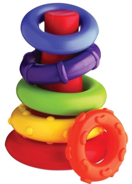 A Gyűrű piramis bébijáték egy színes karikákból álló torony, amiket egymásra tud tenni a pici. Minden karika más színű és mintázatú, a karikákat a baba akár rágókaként is használhatja. A bébijáték fejletszi a gondolkodást, a kézügyességet és a problémamegoldó képességet is, a játék 6 darab gyűrűből áll. Méretek: 13 x 13 x 20 cm. > Életkor:1 - 3 éves k