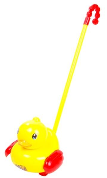 A tologatós bébijáték egy műanyagból készült vidám kacsa figura, hosszú tolórúddal. A mérete: 18 cm. Életkor:3 - 6 éves korig