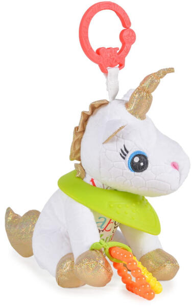 A játék jellemzői: - praktikus medál - puha kendő betétekkel - fogazó - színes, puha fogzó szív alakú a pata mellett - 2 műanyag színű forma a másik pata mellett - suhogó farok - Különféle anyagok textúrája - kor : 0+ -méret: 2cm x 5cm x 15cm