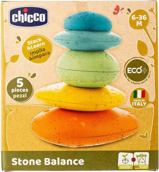 Chicco ECO+ Stone Balance - egyensúlyozó kövek építőjáték. Újrahasznosított műanyagból készült ökotermék, építőjáték és szortírozójáték, 2 az 1-ben. Texturált felület: a játékkövek felülete nem sima, hanem rusztikusak, göröngyösek, érdekes tapintásúak, mint az igazi kövek, melyeket még nem mosott teljesen simára a tó vagy tenger vize és a homok. TARTALMA