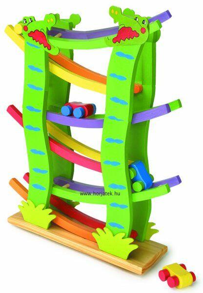A Krokodilos lejtőn haladó kisautókat figyelve kiválóan fejlődik a kicsik szemmozgása. Hosszasan magával ragadja a figyelmet a játék, amint a kis járgányok egyik oldalról a másikra gurulnak, leesnek egy szinttel lejjebb, közben átfordulnak és így folytatják útjukat. A Legler több, mint 30 éve gyárt fából készült játékokat. Márkája, a small foot, jó ideje népszerű