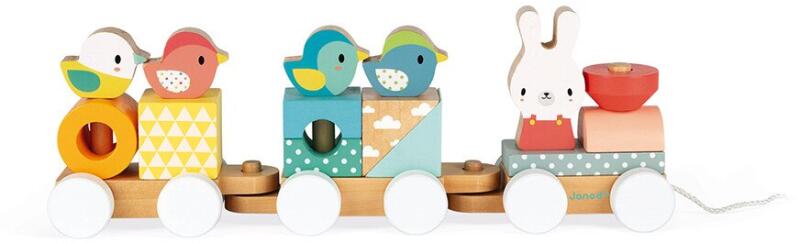 Janod - Pure Vonat húzójáték A csodálatos 2 az 1-ben puzzle vonat 3 kocsival és puha, modern és nagyon aranyos állatokkal rendelkezik. Megmozgatja a gyermekek fantáziáját, és támogatja a motoros készségek fejlődését, miközben húzható játékként is használható. A fából készült vonat 17, vízbázisú festékkel színezett, különböző geometriai formájú blokkból ál