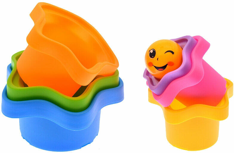 Csillag alakú toronyépítő játék 6 színes elemből, tetején egy mosolygós, csörgős fejjel. Segítségével a gyermekek játszva megtanulják, hogyan tudnak egymásba illeszteni hasonló formájú tárgyakat. A csomagolás mérete: 15 x 12 cm...