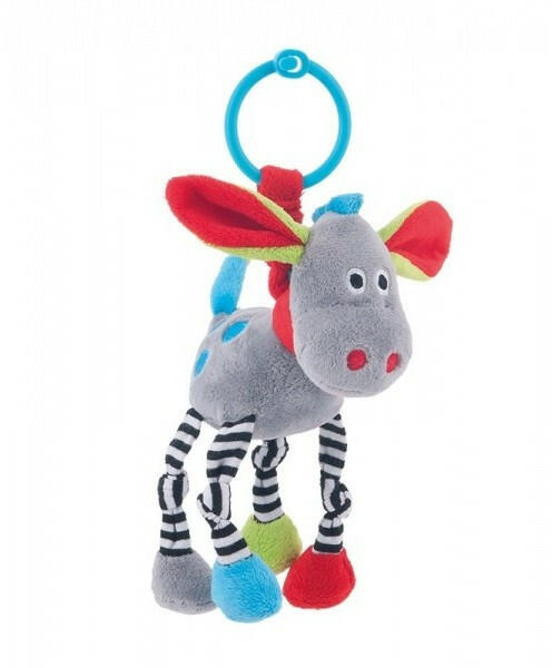 Színes csörgő játék , amely buzdítja a kisgyermeket a játékra, amely serkenti a látási, hallási és mozgási érzékek fejlődését. Az intenzív színek, különféle textúrák felkeltik a kisgyermek érdeklődését. A fogójának köszönhetően könnyen fel akasztható a kocsira, autó ülésre stb.