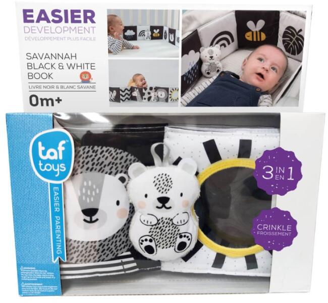A Tay Toys puha könyve a Szavanna kollekcióból használható kiságyba fejvédőként, illetve rögzíthető babakocsiban is. Hajtogatható, megáll az élén, így játékhoz is kiváló, vagy csak pusztán lapozgatáshoz, nézegetéshez. Kétoldalú, így mindkét oldalán különböző képeket nézegethet a kicsi. Minden lapja új, érdekes és színes mintákat rejt. Csörgő és biztonsá