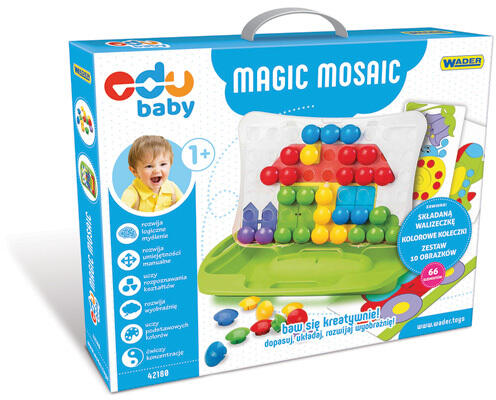 Pattintsd és párosítsd! Varázslatos mozaiképítő pötyijáték a Wadertől a legkisebbeknek. A mozaiképítő játékok a színek felismerését, párosítását segítik megtanítani az óvodás gyermekeknek. Színes pötyielemek, praktikus és hajtogatott bőrönd jellegű csomagolás, érdekes táblák, külömböző mintákkal, ezek garantálják a nagyszerű szórakozást, amely valósz