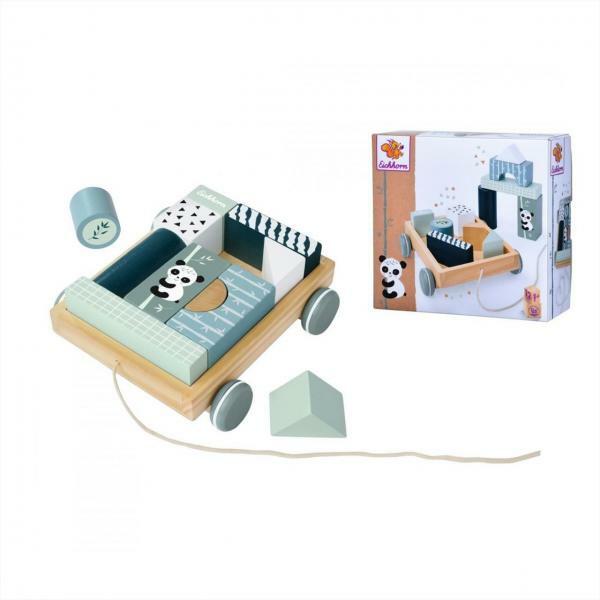 Fa építőkockák gurulós utánfutóval Ajánlott életkor: 1 éves kortól A gyerkőcök könnyedén megismerkedhetnek a játékon keresztül a különféle színekkel és formákkal A járműre rögzített kötélnek köszönhetően a gyermek mindenhova tudja maga után húzni a kis kocsit A készlet tartalmaz 12 darab több féle fa építőkockát, amelyek újrahasznosított fából készül