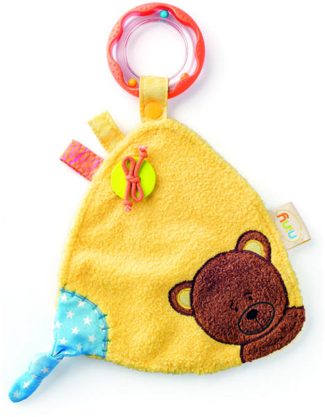 Puha, plüss anyagból készült maci mintás játszókendő műanyag csörgővel. Zörög, rágható és minden helyzetben szórakoztatja a babát. Hossza (felfüggesztéssel): 30 cm. Színe és formája fejleszti a gyermek kézügyességét és szem koordinációs készségét. Már újszülött kortól is!