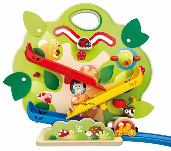 Golyópálya az erdőben. Figyeld, ahogy a kis mókus a fa ágai között leszalad a földre, és alul zenél az apró csengő!Vezesd el a katicát a lombok között egyik oldalról, a másikra, forgasd meg a kis gömböt, melyen a pillangó látható!Találd meg a fűben a sünit, vagy az odúban a baglyot, esetleg tapintsd a textil faleveleket!Mind olyan játék, mely egy-egy rész képességet