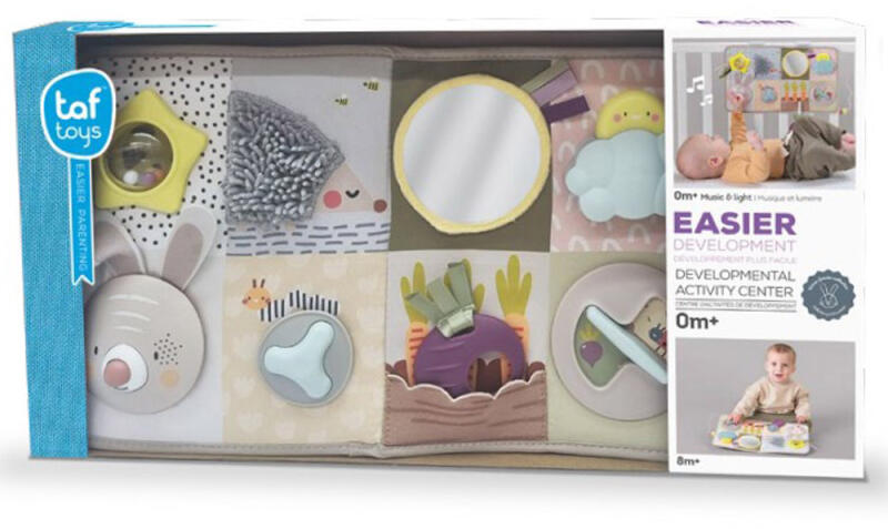 Fejlesztő tevékenységközpont zenével és fénnyel, amely együtt nő a babával. A különböző funkciókkal való játék serkenti a baba érzékszervei fejlődését, a finom- és nagy-motorikát, valamint a szem-kéz koordinációt. Fejlesztő tevékenység központ zenével és fénnyel, 3 fejlődési szakaszban használható: - 1. szakasz (0 hó): Háton fektetés – A kiságy oldalán