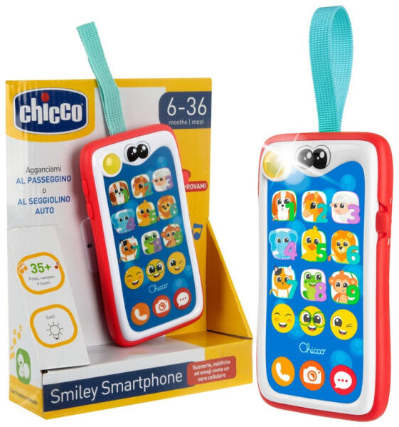 Ha már nem bírod, hogy mindig elkéri a tiédet... Itt az idő, hogy legyen saját okostelefonja a gyereknek!A gyerek első elektronikus okostelefonja, a Chicco Smilye smartphone, mindent tud, amire szükség van:- 15 érintőgomb- fények- szép dallamok- állathangok- hangeffektusok- stand-by üzemmód 60 mp után- babakocsira akasztható a tépőzár segítségévelHalláskészséget és fino