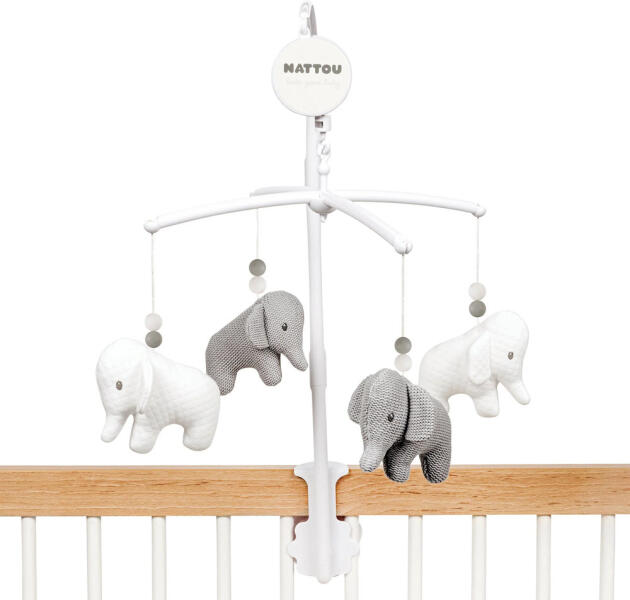 Játék Nagyszerű Nattou zenélő-forgó, amely a felhúzását követően kedves dallamokat játszik, így a baba könnyedén álomba tud merülni. Elefánt figurákkal, puha, pamut anyagból. A kiságyra lehet rögzíteni.