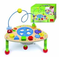 Activity asztal a legkisebbek számára, golyóvezetővel, formabedobóval, formaberakóval, forgatható fogaskerekekkel. A Goula Játszóasztal használatával fejlődik a gyerekek forma és szín felismerése, a tekergővel pedig a szem-kéz koordináció és a finommotorikus képességek fejleszthetőek. Az asztal felborulása miatt, mászásra nem alkalmas!