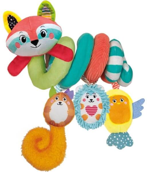 Mit kell tudni a játékról? Plüss babakocsi spirál játék - Clementoni B arátságos állatkák, mindenfajta színes, pöttyös és csíkos kivitelezésben. Egymásba karolva várják a pici kezek matatását. A kellemes anyagoknak, színeknek, formáknak, érintésnek köszönhetően a baba megismerkedik mozdulatainak „következményeivel, azaz az állatkák nyomásra, érintésre zörgő,
