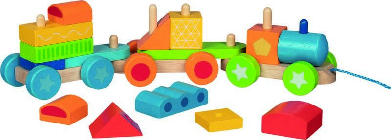 Fa vonat 3 kocsival és 15 színes fomakockával, különböző geometriai formákkal, amelyeket a gyermek sokféleképpen elrendezhet és összeszerelhet, fantáziáját felhasználva, ami igazán szórakoztatóvá teszi a játékot. A termék méretei: 36,5 x 7,2 x 9,1 cm. Alkatrészek száma: 18. Anyaga: fa.