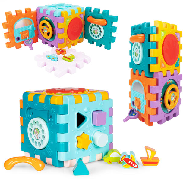 INTERAKTÍV KOCKA GYEREKEKNEK - 18 hónapos kortól kisbabáknak - Minden falon más-más tevékenység a gyermekek számára - Hangok, dallamok és fényhatások - A falak puzzle alapon kapcsolódnak össze - a szétszerelés lehetősége - Szortírozó különböző formájú blokkokkal - Kulccsal működtetett ajtók - Telefon mozgó tárcsával és számokkal - Forgatható kormánykerék DALLA
