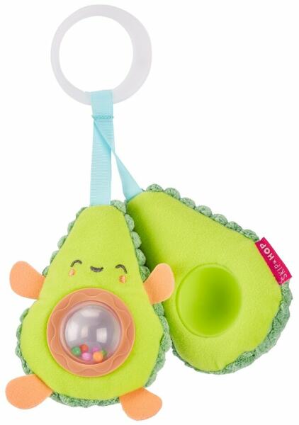 Készüljön fel a szórakozásra a cuki avokádóval! A két félnek köszönhetően, amelyek összetartják, a kicsi kezek számára könnyű az avokádót kinyitni és ismét bezárni, ezzel fejlesztve a baba tapintását. Belül egy meglepetés vár átlátszó kocka formájában, amely színes gyöngyökkel van megtöltve. A játék tartalmaz egy C-karikát, aminek köszönhetően rögzíthet
