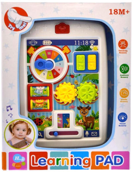 Elemes foglalkoztató baba tablet hang effektusokkal. A kicsiket hosszú időre lefoglaja a baba tableten található kerekek, nyilak és gombok. Segítségükkel többféle állatot, számokat ismerhetnek meg és különböző dallamokat, hangokat hallhatnak. A játé...