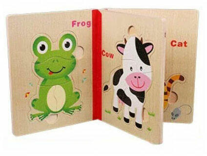 Játék baba könyv, 6 lapozható oldallal. Minden oldalán kirakóval. Mérete: 14,3 x 17 x 2 cm. Anyaga: fa. Többféle mintával is elérhető.