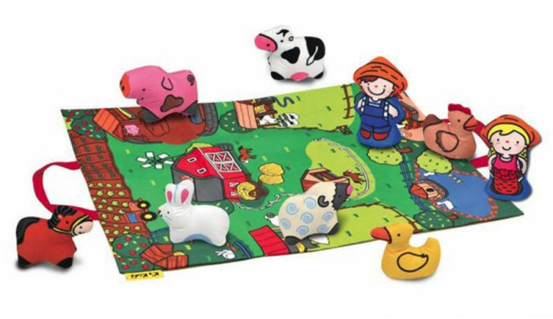 Ks Kids Farmos játszószőnyeg, állatfigurákkal. Félbehajtható, hordozható játszószőnyeg 7 darab puha kis farmon élő állatfigurával, egy darab puha farmer és egy darab puha farmerlány figurával. A farmot ábrázoló mintán minden megtalálható ami egy érdekes farmhoz kell: istálló, ólak, tó, szántóföld stb. A játék remekül fejleszti a babák érzékelését, finommotor