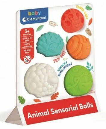 Az érzékfejlesztő labdák a puhaságuknak, a deformálható anyaguknak és az érdekes textúrájuknak köszönhetően, serkentik az összes érzékszervet. A nem mérgező anyagból készült Clementoni labdák moshatók, fertőtleníthetők, a gyerekek játszhatnak velük a vízben, dobálhatják és akár rájuk léphetnek minden veszély nélkül. Az 5 különböző állatfigurát tartalmaz
