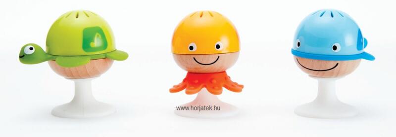 A csecsemőket elvarázsolják a csörgők különböző hangjai, élénk színei és a kedves, mosolygós víziállatokat mintázó formái. Sőt, a praktikus tapadókorongoknak köszönhetően a játék bárhol, bármikor használható, mert felcuppantva nem potyognak le!Etetőszékben, padlón, de akár ablakra tapasztva is lehet vele játszani.