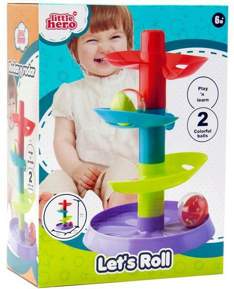 Golyófuttató pálya kicsi méretben Ajánlott életkor: 0-1 éves korig Lányoknak és fiúknak is egyaránt ajánljuk Méretei: 20 x 20 x 28 cm A pálya egy színes torony, amin a golyók tudnak haladni A golyókat a torony legmagasabb pontjáról kell elindítani, amely folyamatosan gyorsul, utána lepottyan, majd a tálcán landol A pályát elemenként lehet összerakni A játék fejleszti a