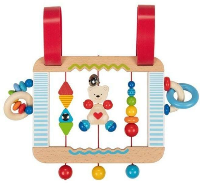 Babafoglalkoztató állvány fekvő, már ülni tudó, illetve járni tanuló babáknak. Sok színes, mozgó, csörgő elemmel, melyek lekötik a baba figyelmét. A középső maci figura levehető az állványról. Kerekei is vannak, így a járni tanuló babák járássegítőként is használhatják. A felső rúd magasság 5 ponton állítható. Méret: 670 x 530 x 550 mm Anyaga: fa