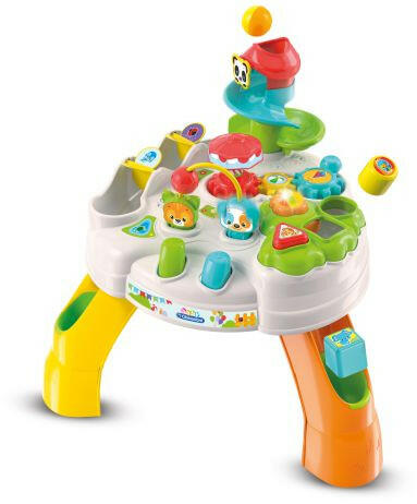 Baby Clementoni - Baby Park Játékasztal A Baby Clementoni Activity Table egy szórakoztató játék elektronikus és interaktív elemekkel, amely kiválóan illeszkedik a kalandparkok szórakoztató világába. Számos funkciót tartalmaz: interaktív alakzatválogató terület fényekkel és hangokkal, ahol a szerszámok forognak, a karakterek pedig gombnyomásra mozognak. Tartalmaz egy szórak