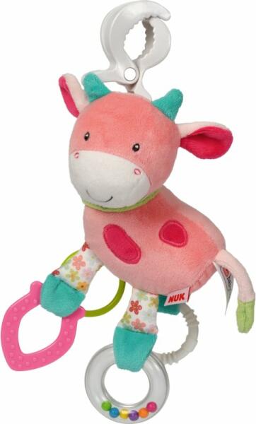 A NUK játékok kellemes anyagokból készülnek, serkentik az érzékeket és abbahagyják a szórakozást. Kényeztesse legfiatalabb barátját, hogy kísérje el őket az élet első lépésein. Vidám Kravička az új Happy Farm kollekcióból, gyönyörű és színes színekben, végigvezeti a gyerekeket a farmon. A NUK kapcsos gyermek plüss játék egy vidám és puha játék, amely beépí
