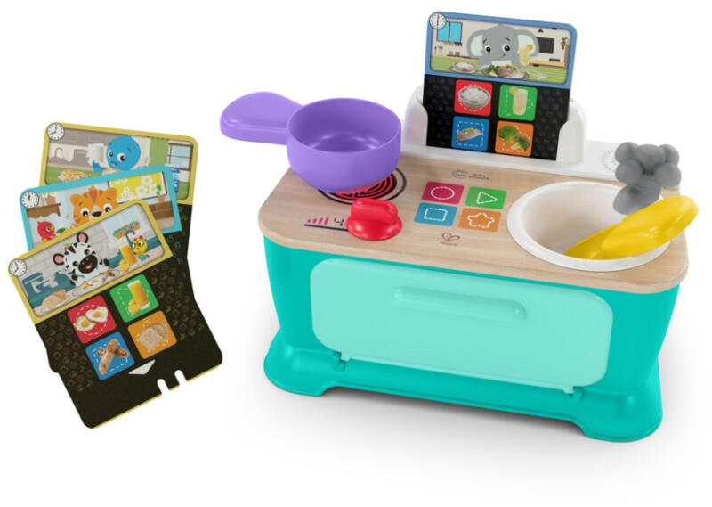 A Baby Einstein Zenélő játék konyha Magic Touch Kitchen Pretend to Cook HAPE 9 hónapos kortól a tökéletes játék a kis séfeknek. A Magic Touch technológiának köszönhetően a konyha gyengéd érintésre is reagál, így a legkisebbek is élvezhetik a főzés élményét. A konyha rengeteg izgalmas funkcióval van ellátva, mint a sütő, a mosogató, a tűzhely, a hűtőszekrény és